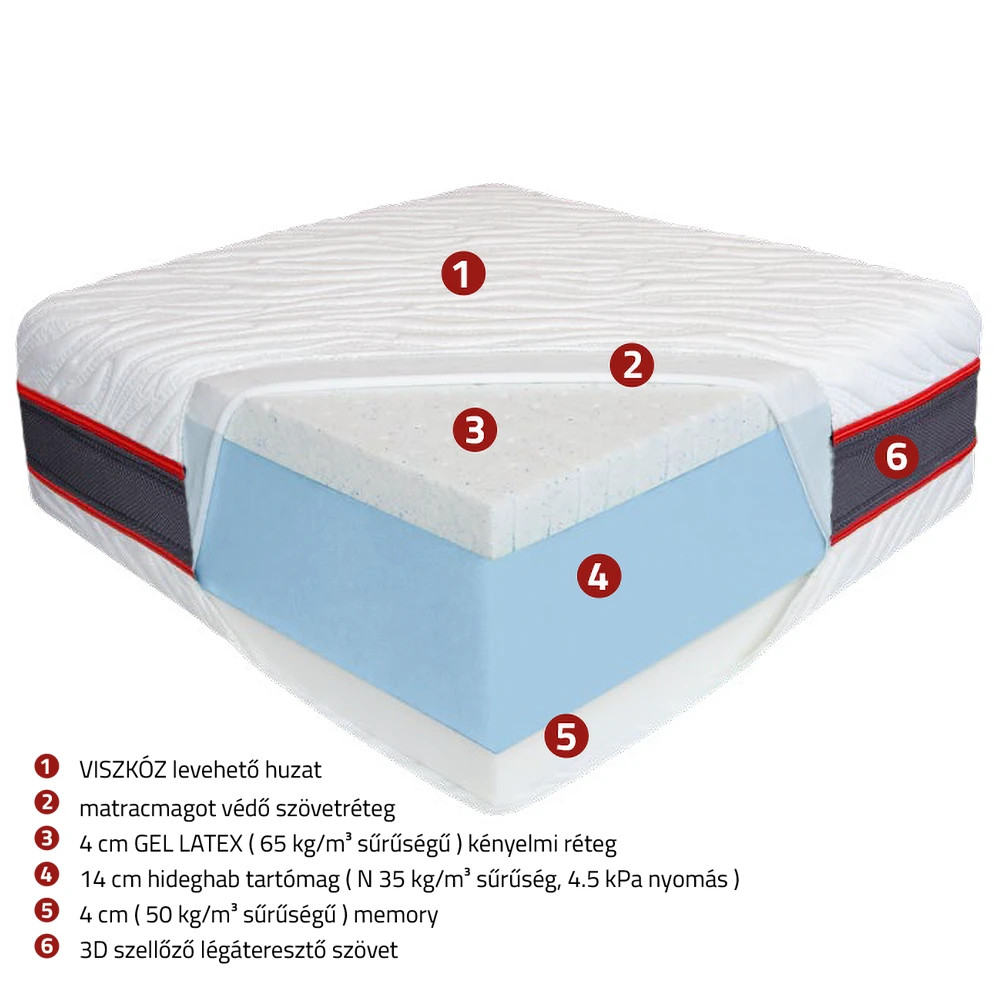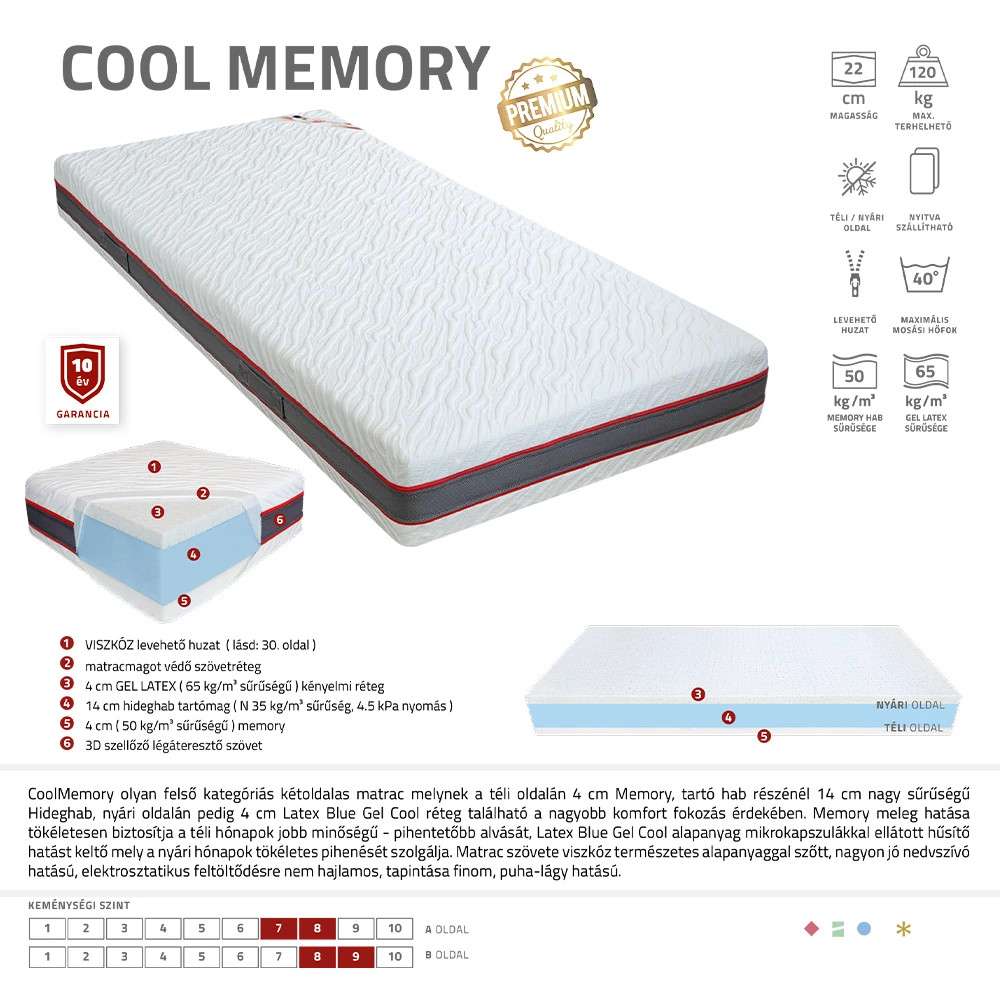 A Best Dream Cool Memory egy 22 cm magas, kétoldalas memóriahabos matrac, melynek téli oldalán Memory, nyári oldalán Latex Blue Gel Cool réteg található.