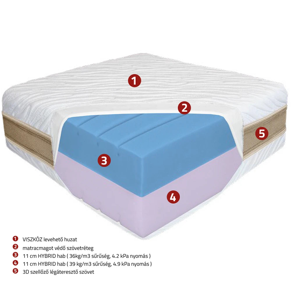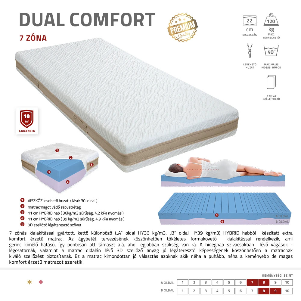 A Best Dream Dual Comfort matrac ideális választás azoknak a pároknak vagy egyéni alvóknak, akik a keményebb és a lágyabb komfortzóna között szeretnek váltani. A matrac két különböző keménységű HYBRID habból épül fel, így mindenki megtalálhatja a számára tökéletes komfortoldalt. A speciális 7 zónás kialakítás a test anatómiájához igazodik, miközben a kiváló légáteresztés gondoskodik a friss alvási környezetről.