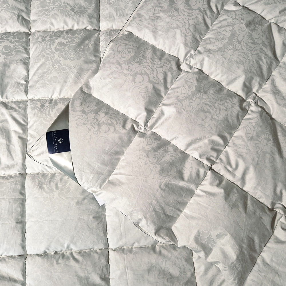 A paplan töltete I. osztályú szürke lúdtoll és pehely kombinációja, 90% pehely tartalommal. A huzatanyaga fehér színű, szőtt mintázattal rendelkezik, mely 100% pamutból készült, és kiváló párakezelő képességet biztosít. Az alapanyagok és az eljárások gondos válogatásának köszönhetően a paplan rendkívül puha tapintású és rendkívül dekoratív megjelenésű exkluzív darab.