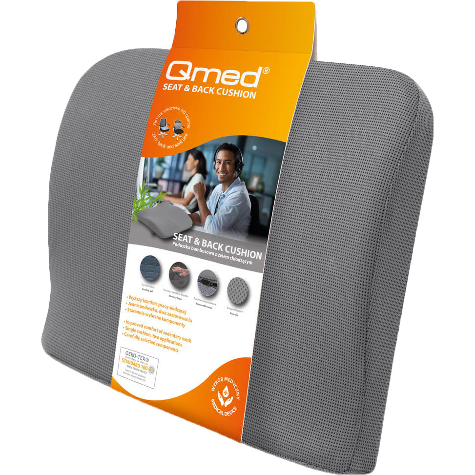 Ülőmunka során az izmoknak muszáj egy fix helyzetben tartaniuk a törzset, a nyakat és a tarkót, ami csökkentheti a véráramlást és állandó feszültséget okozhat a gerinc alsó részén, valamint a comb- és fenékizmokban. A QMED Bamboo&Gél ülő- és hátpárna kiváló kényelmet biztosít, támogatva a helyes testtartást hosszú ideig tartó ülés során. A párna ergonomikus és kontúrozott kialakítása lehetővé teszi a két síkban történő használatát. A testnyomás hatására aktiválódó rugalmas hűtőgél réteg kellemesen hűti a bőrt, növelve ezzel a hosszú ülés kényelmét. Anyagában bambusz szénport tartalmaz, ami antibakteriális, nedvesség- és szagelnyelő hatásával hozzájárulhat a stressz és fáradtság érzetének csökkentéséhez.