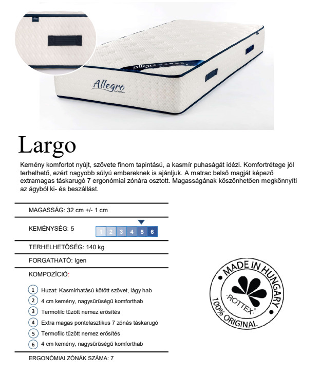 A Rottex Allegro Largo egy 32 cm magas, kemény, 7 zónás táskarugós matrac.