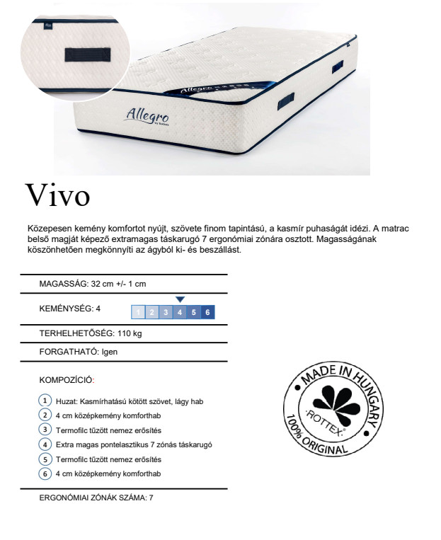 A Rottex Allegro Vivo egy 32 cm magas, közepesen kemény, 7 zónás táskarugós matrac.