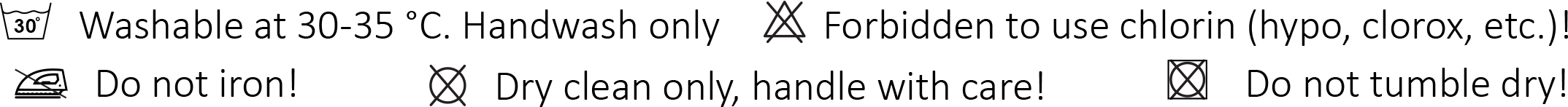 Lukewarm, warm hand water (25-35 °C), with wool detergent, clean it with careful pressure. Do not allow stand in the water! After that with cold water rinses it off, and carefully squeeze the water out of it. Neither twisting nor rubbing is good for the material.