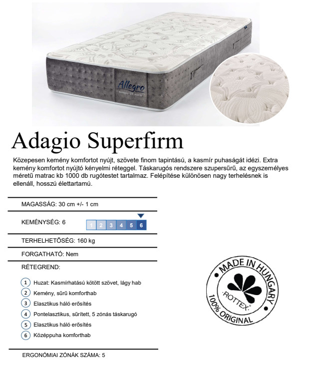 A Rottex Allegro Adagio GT Super Firm egy 30 cm magas, extra kemény, 5 zónás táskarugós matrac 160 kg/fő teherbírással.
